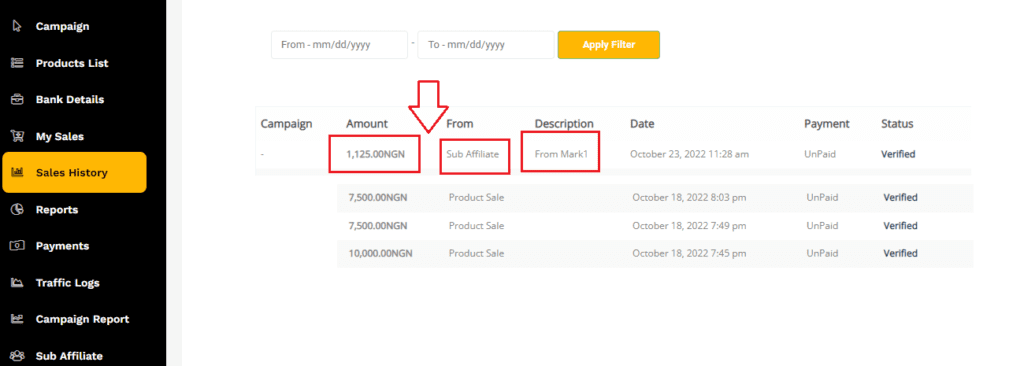 👉To see the amount you have earned click on Dashboard but To see your earning History click on Sales History