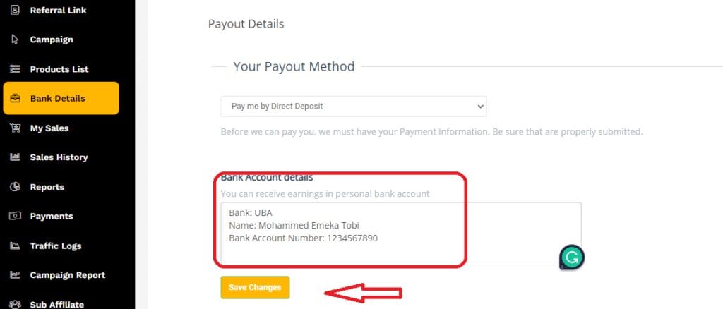 👉Go to https://www.offcamp.com/affiliate-portal/ and click on Bank Details at the right corner of your screen to set up your payout information. Enter Your Bank Name, Your Name, and Bank Account Number and then click SAVE Changes