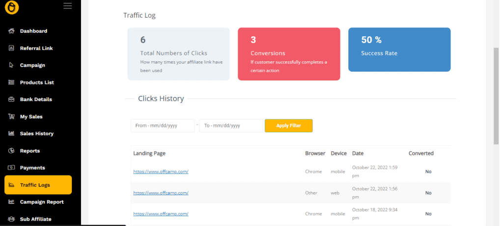 👉Offcamp comes with a Supper technology that tracks all click and provides it as a report. You can see who click your Affiliate link, which platform, device, Time, and which of your affiliate link was clicked. To see Traffic History, click on Traffic Logs